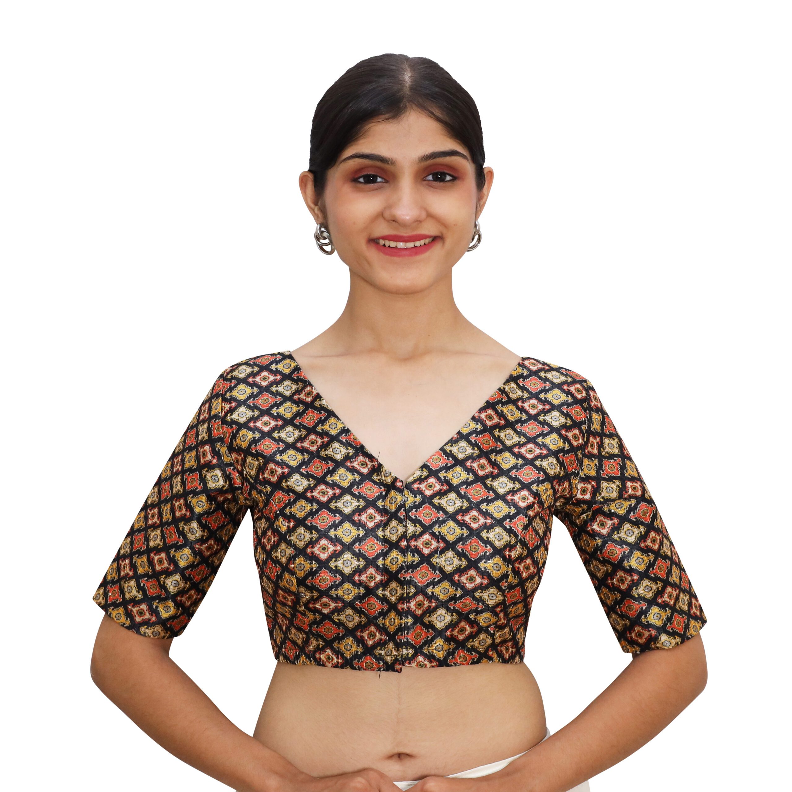 Elegant Black Print V Neck Blouse | Embroidered Saree Blouse