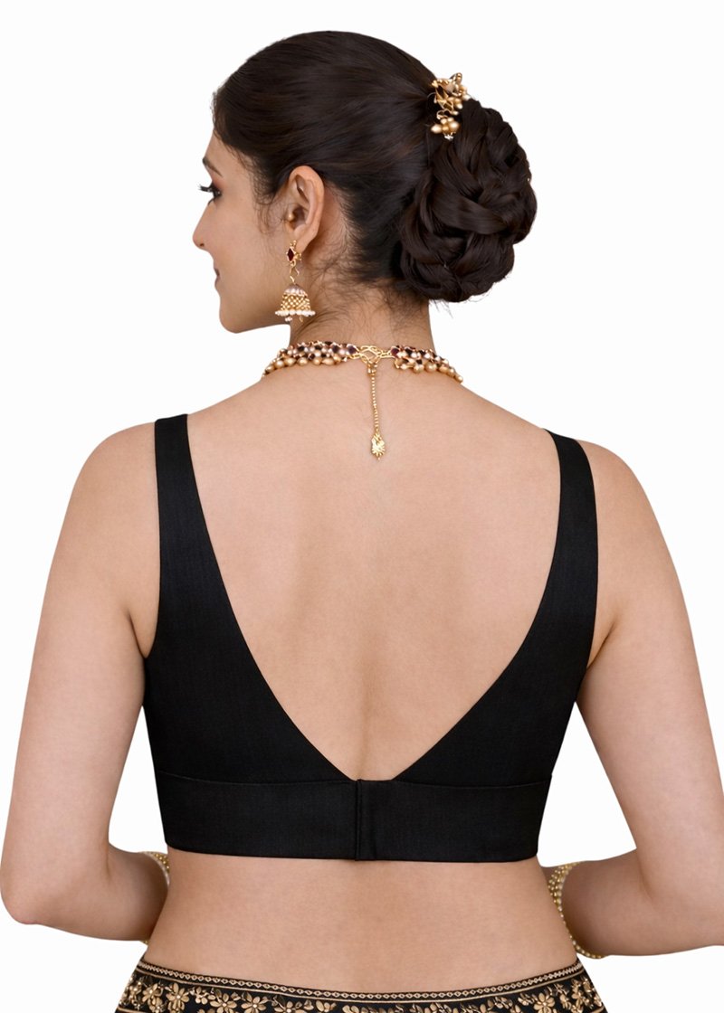 Black Bangalori Silk Sleeveless V-Neck Blouse for Women | Padded Cotton Lining | Designer Saree Blouse