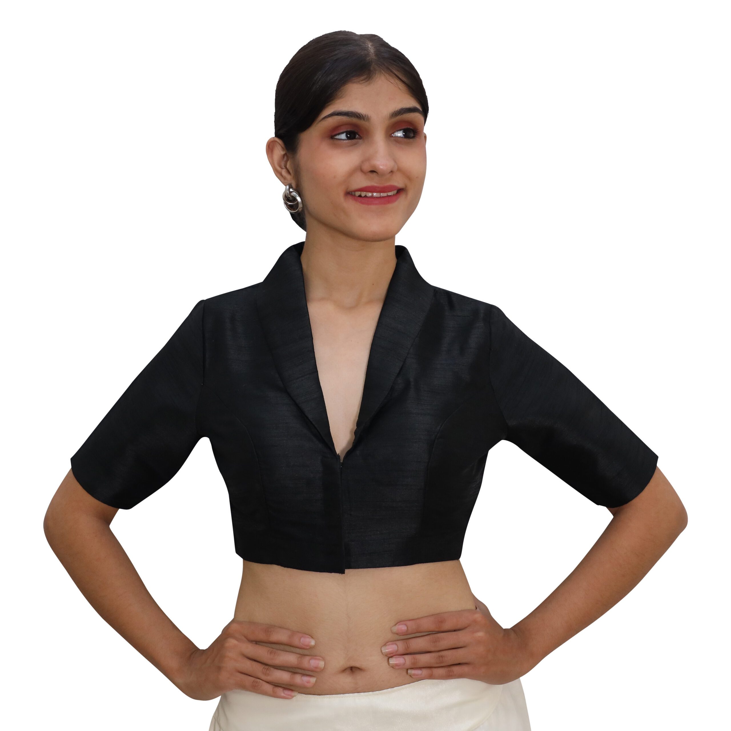 Bring sophistication to your ethnic collection with this black collar blouse for women from India Blouse. Expertly crafted from premium Bangalori silk and lined with soft crepe, this designer blouse for women offers both luxurious texture and superior comfort. The stylish collar neckline adds a contemporary twist to your saree look, blending modern fashion with traditional elegance.