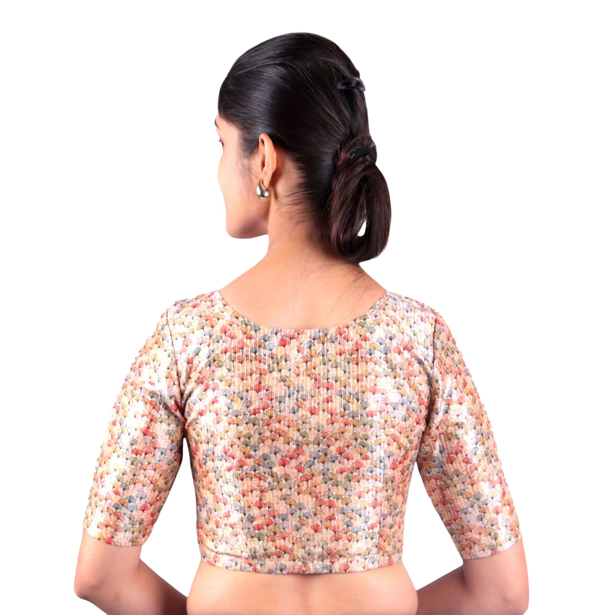 Add a chic and vibrant touch to your saree look with this multi-color printed V-neck blouse featuring an embroidered texture from India Blouse. Crafted from premium polyester fabric and accented with digital print embroidery and sparkling sequin details, this women’s designer blouse is a fusion of traditional elegance and modern flair. The flattering V-neckline enhances your feminine silhouette, while the short sleeves ensure all-day comfort for any occasion.