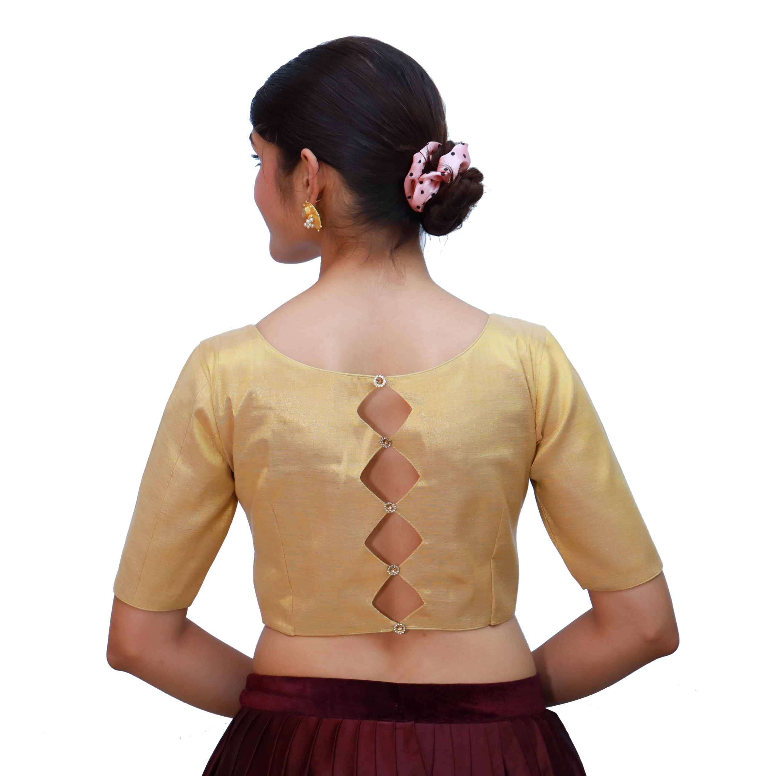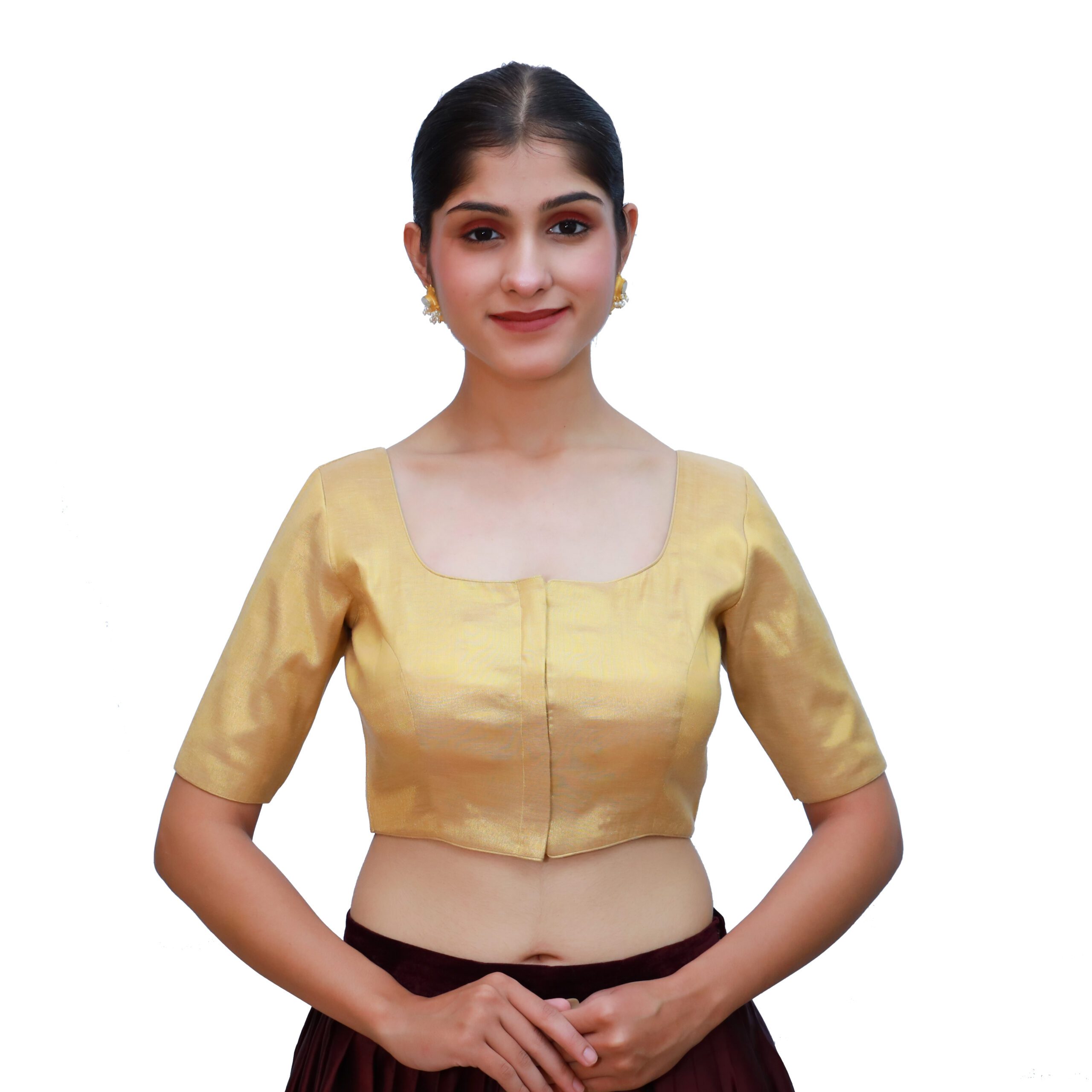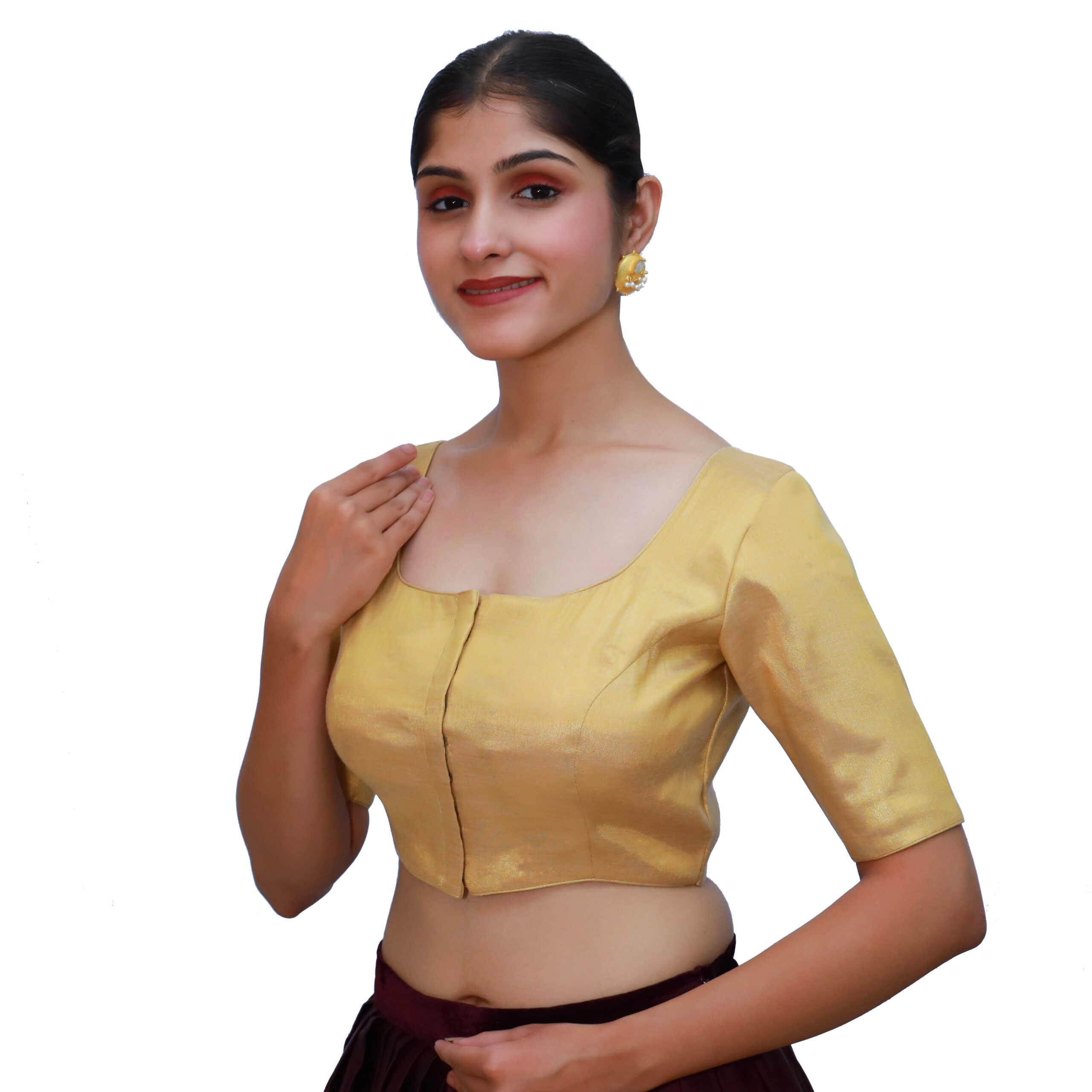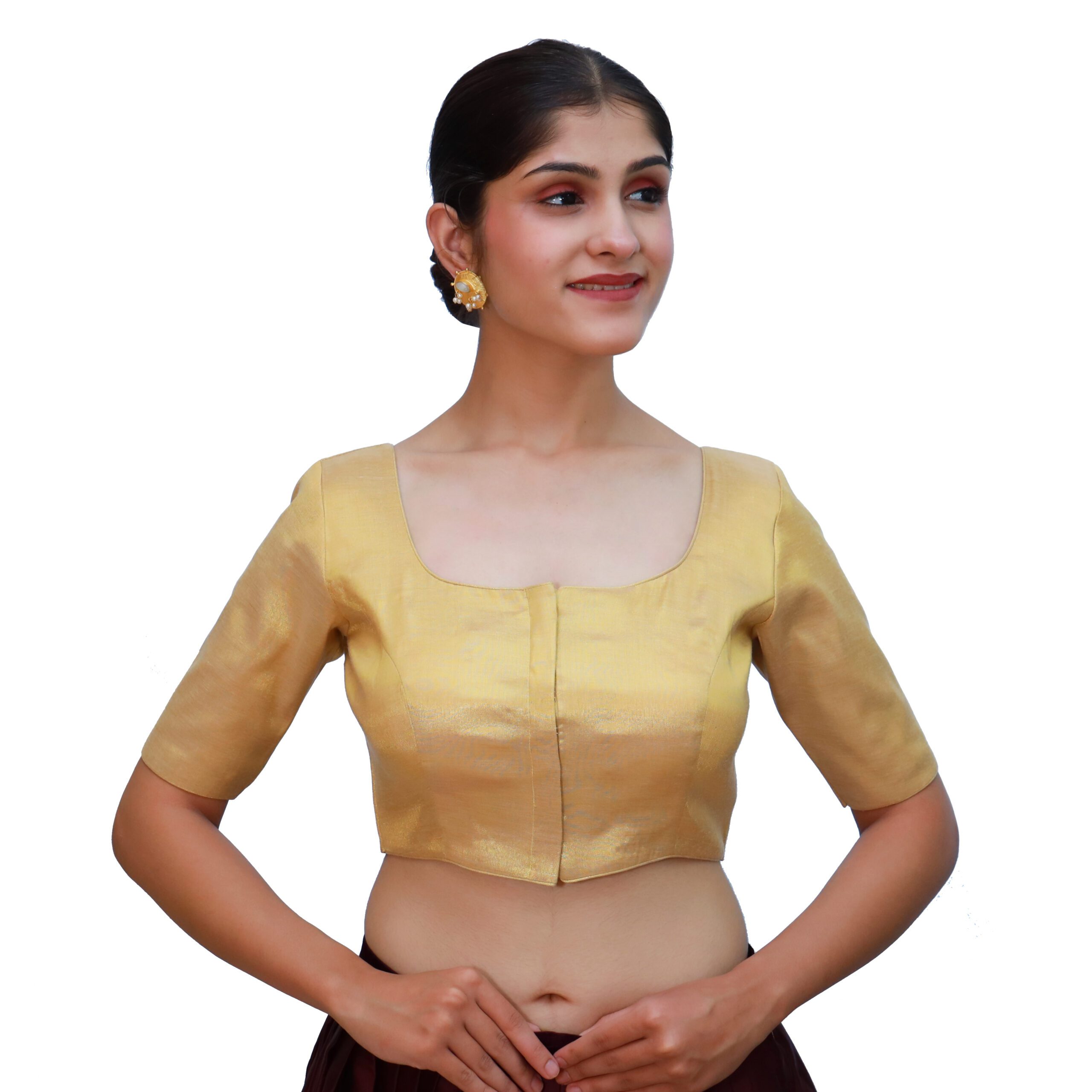 Enhance your ethnic wardrobe with the gold round neck blouse from India Blouse. Crafted from premium tissue fabric, this gold round neck blouse features a padded fit for added comfort and structure. The round neckline and short sleeves provide a timeless appeal, while the front hook-and-eye closure ensures both style and ease of wear. Its rich gold hue makes it a perfect match for almost any saree, whether it be vibrant silks, embroidered drapes, or subtle pastels. Whether for a wedding, reception, festive celebration, or party, this gold round neck blouse adds a touch of sophistication to every saree ensemble.
