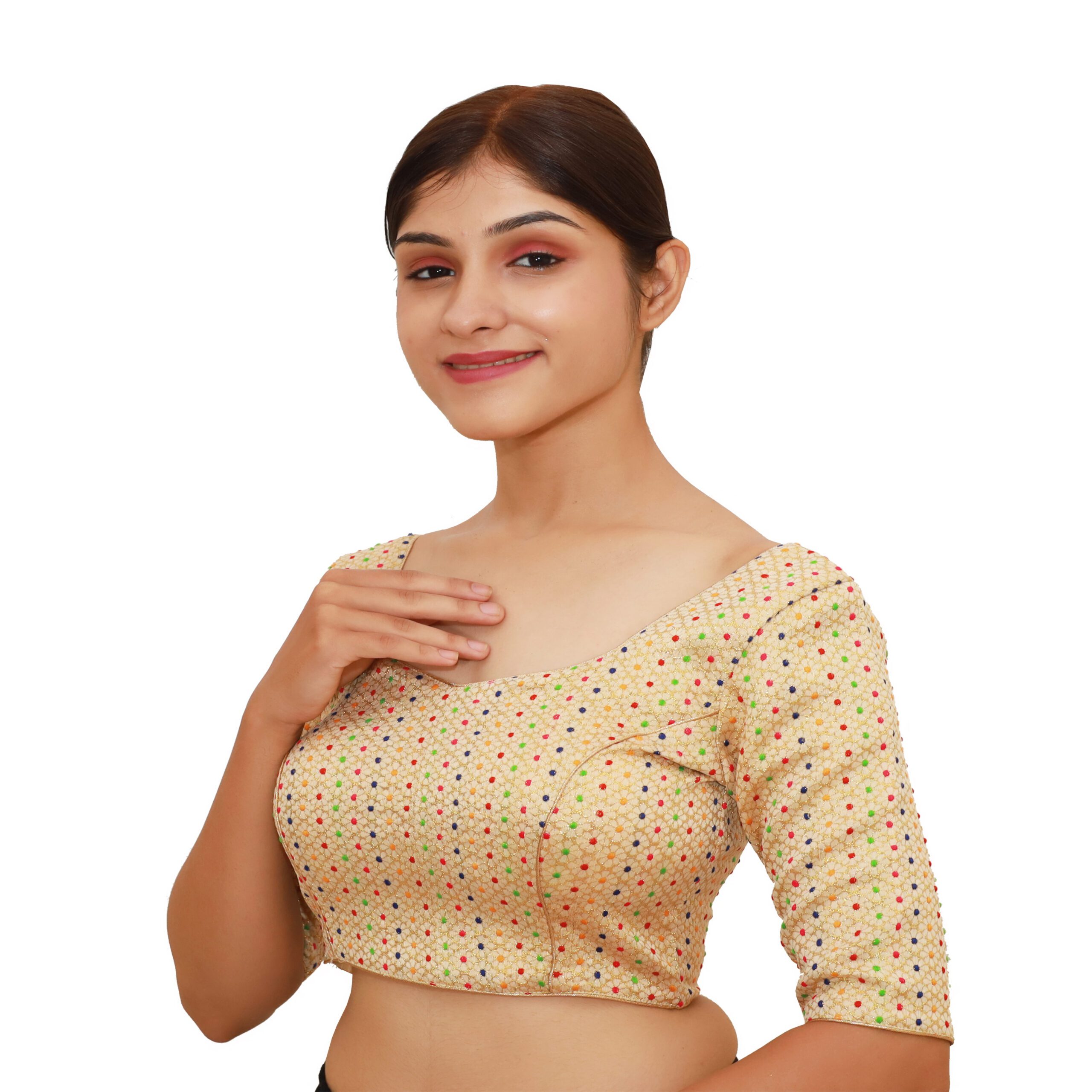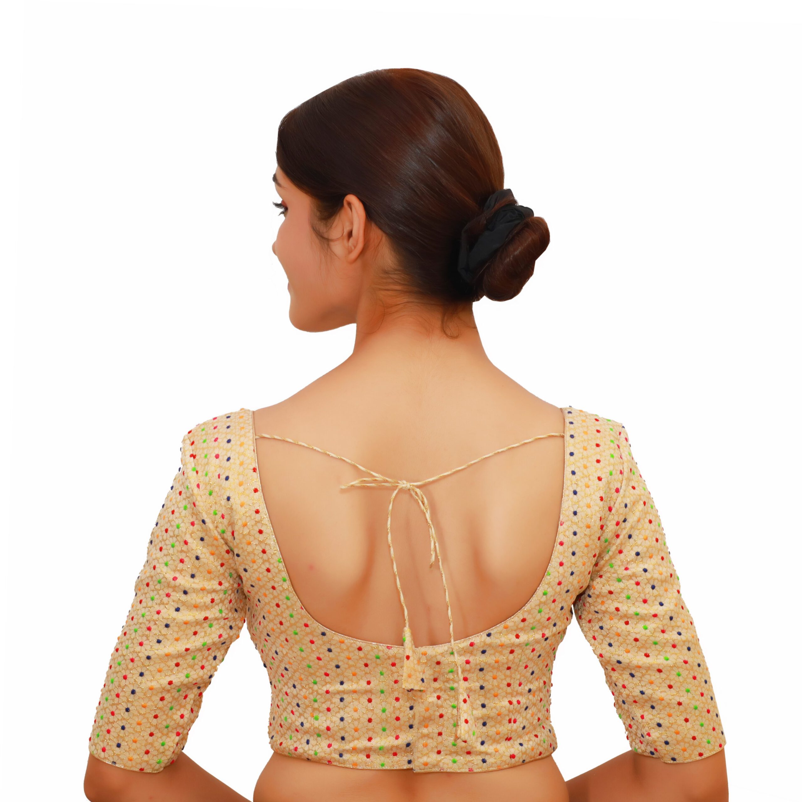 Start from the top of your shoulder (near the neck) and measure straight down to the point where you want the blouse to end. This helps you choose the blouse length that best matches your saree style.