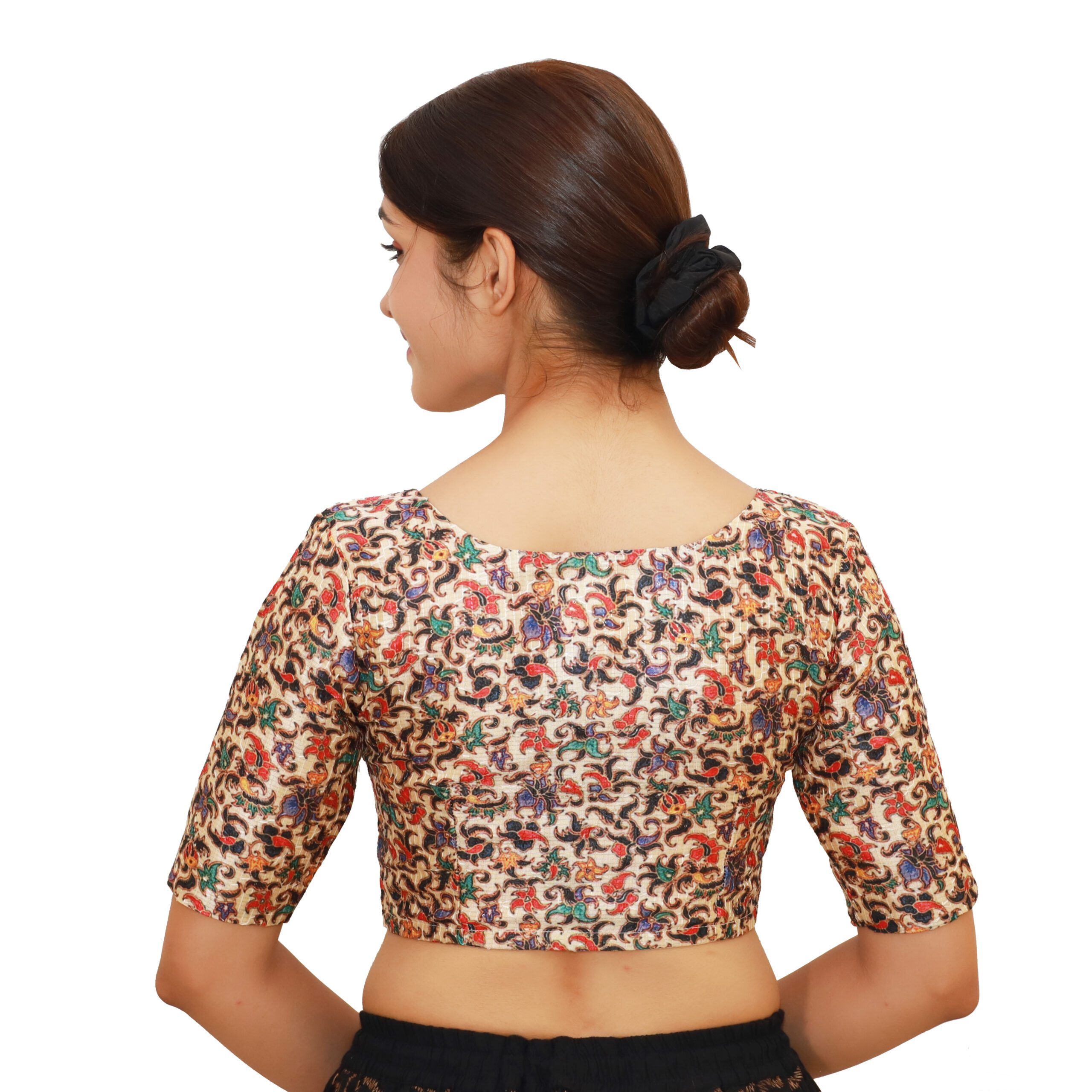 This multi-print V-neck blouse is non-padded and is light and breathable, making it suitable for long celebrations and everyday use. The secure front hook and eye closure makes it easy to wear and ensures a seamless fit. Effortlessly pair this versatile blouse with plain, embellished, or embroidered sarees—whether silk, georgette, chiffon, or cotton—for festive occasions, parties, or stylish daily ethnic looks.