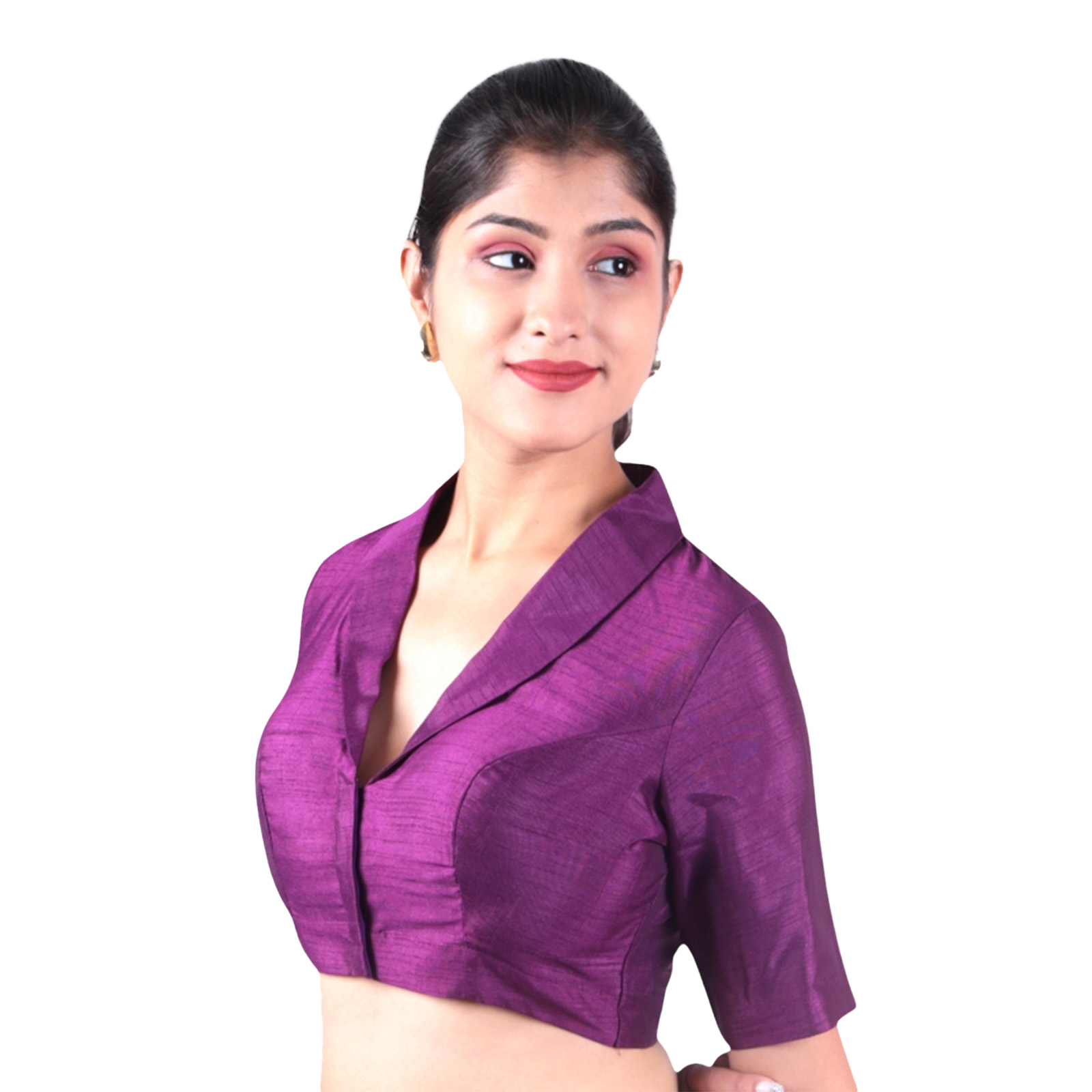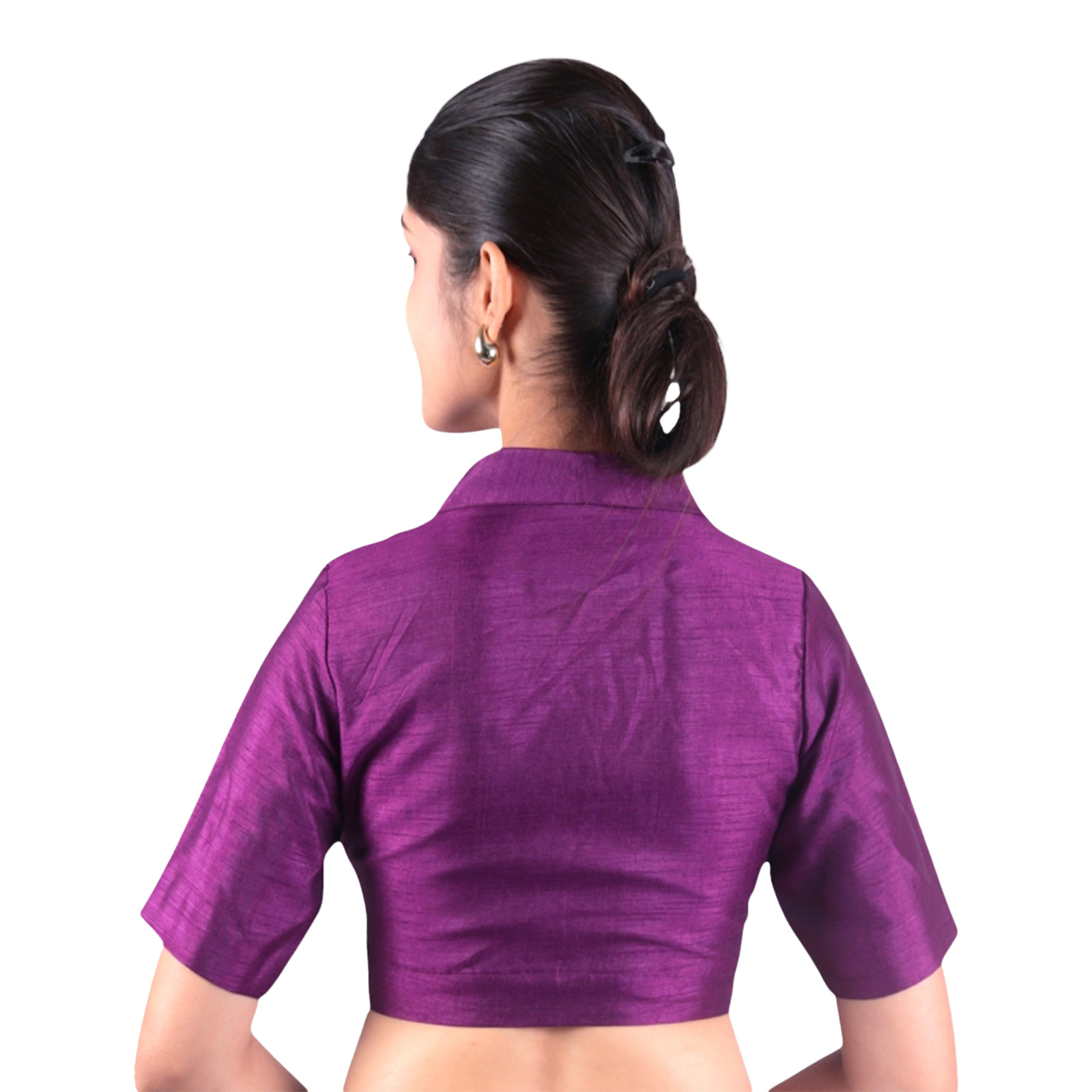 Step into elegance with this purple collar neck blouse from India Blouse. Crafted from premium Bangalori silk and lined with soft crepe, this designer blouse for women brings together luxury, comfort, and timeless appeal. The bold collar neck design offers a graceful, structured look, while the half sleeves add a touch of traditional charm to your ethnic wardrobe.