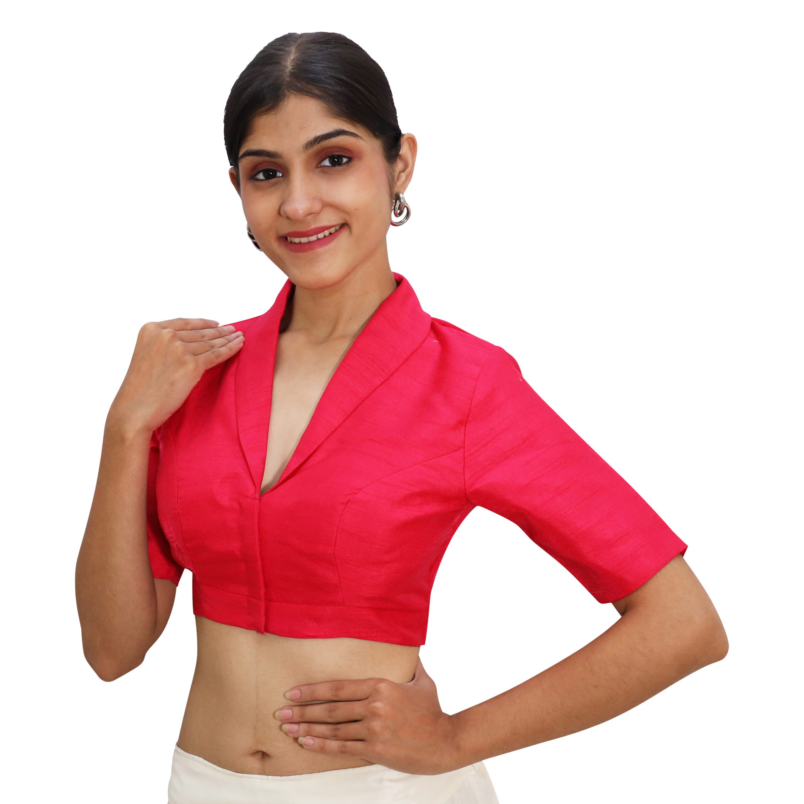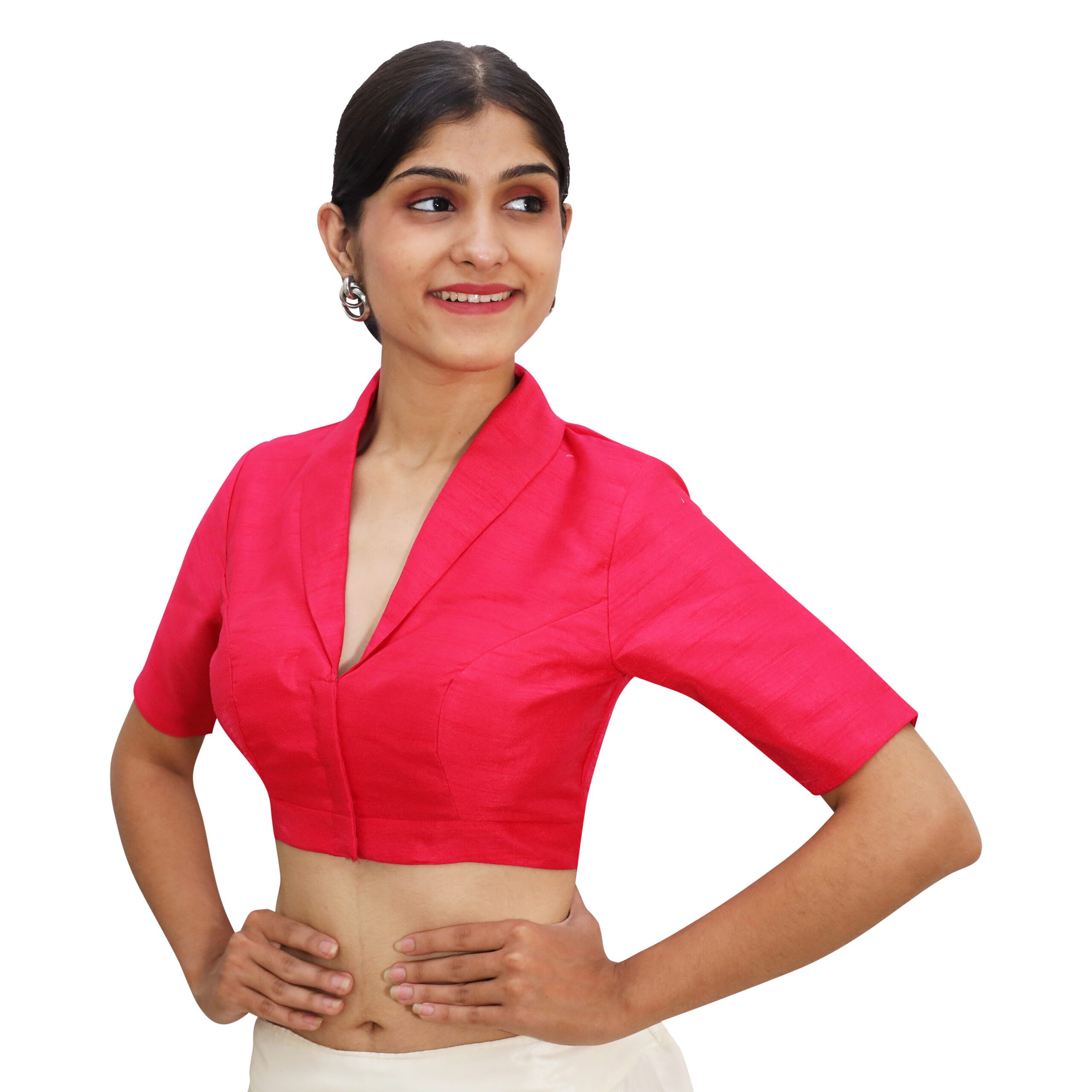 Add a touch of elegance to your saree collection with this Rani Pink Collar Neck Blouse from India Blouse. Crafted from premium Bangalori silk and lined with soft crepe, this designer blouse for women delivers both luxury and all-day comfort. The chic collar neckline brings a sophisticated, structured look to your ethnic wardrobe, while the half sleeves make it a versatile choice for both traditional and contemporary saree drapes.
