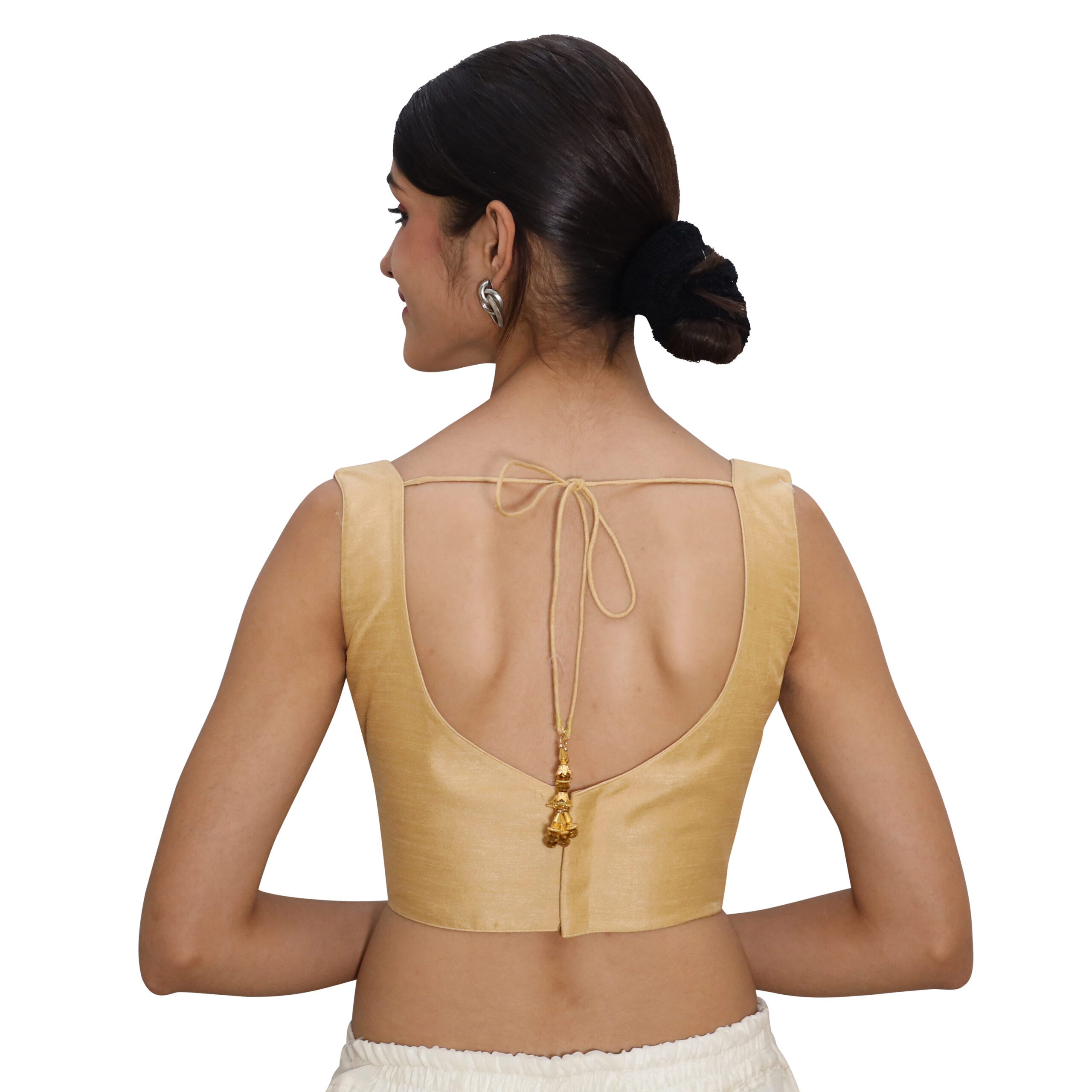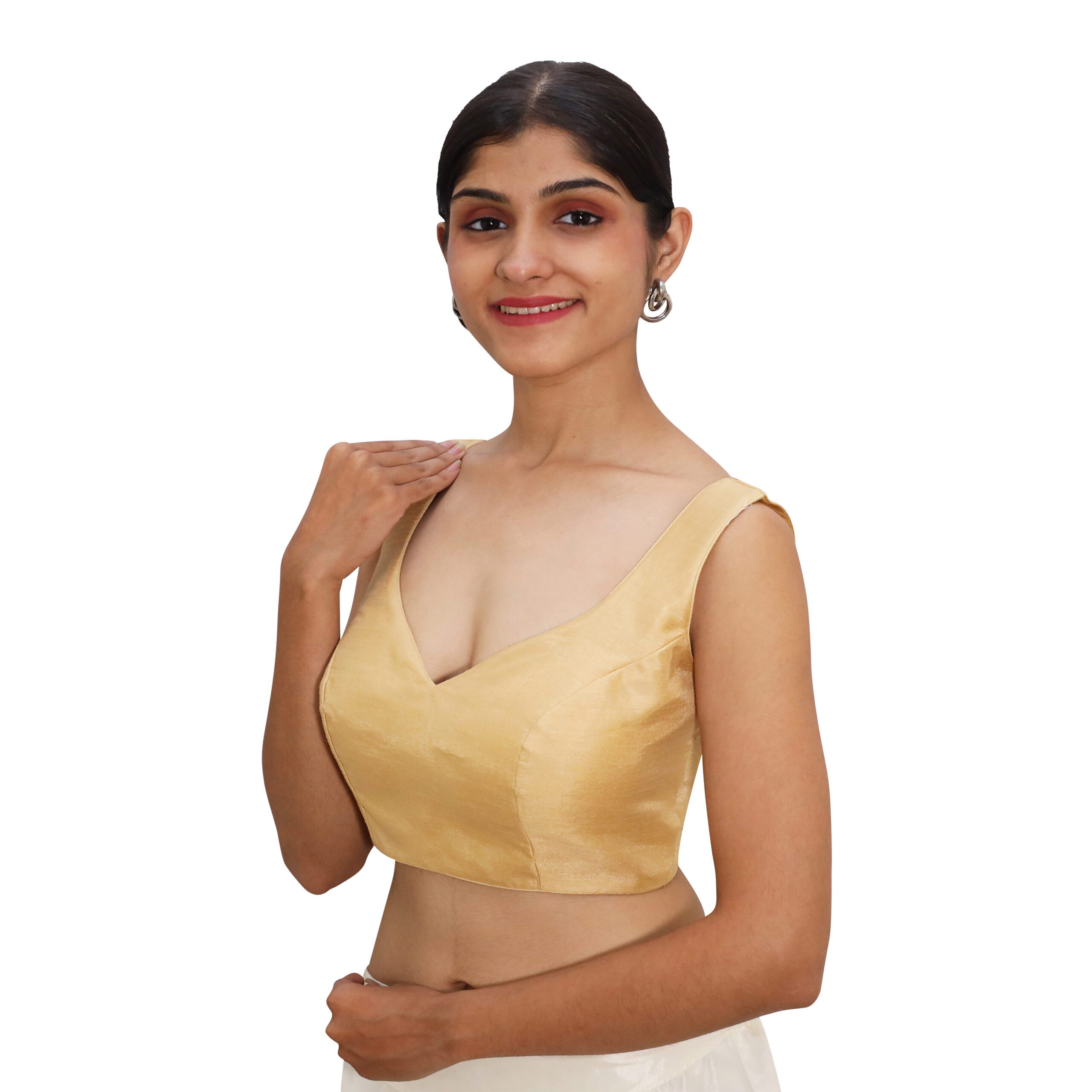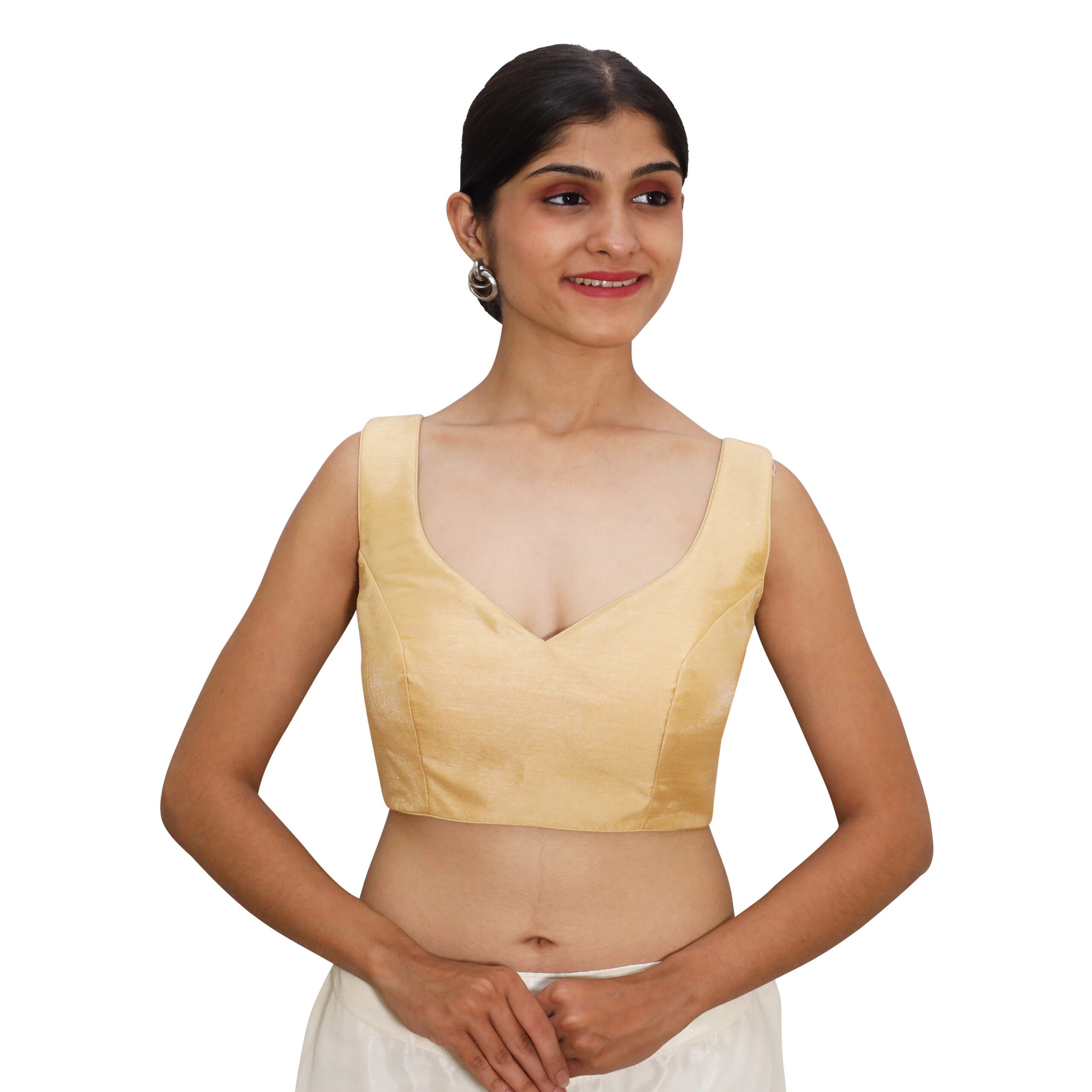 Add a touch of glamour and sophistication to your ethnic wardrobe with the gold sleeveless sweetheart blouse for women from India Blouse. Beautifully crafted from luxurious Bangalori silk and lined with smooth, comfortable crepe, this padded blouse for women is designed to make you stand out at every special occasion.