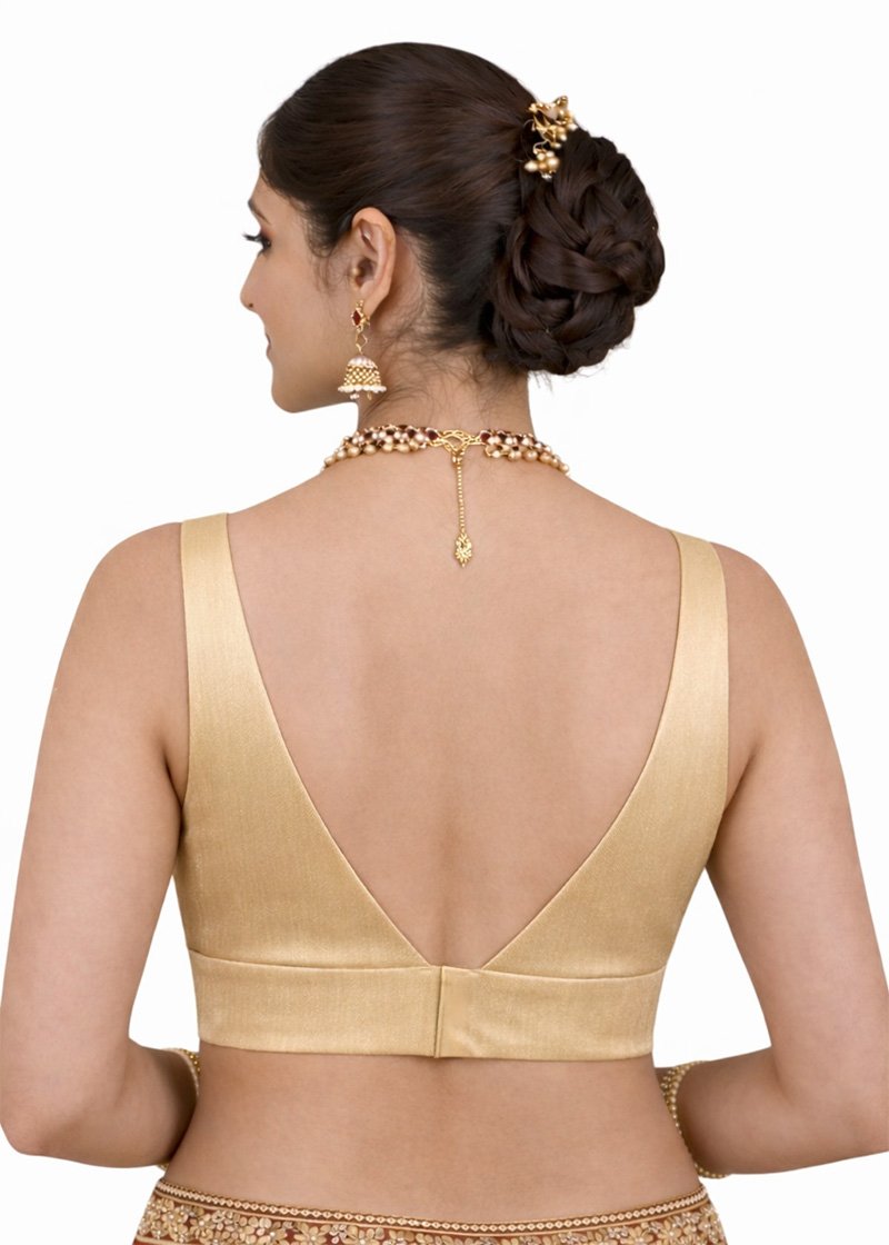 Golden Bangalori Silk Sleeveless V-Neck Blouse for Women | Padded Cotton Lining | Designer Saree Blouse