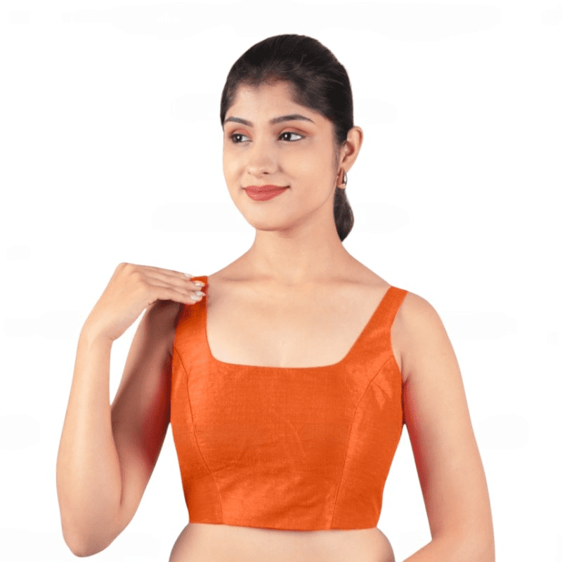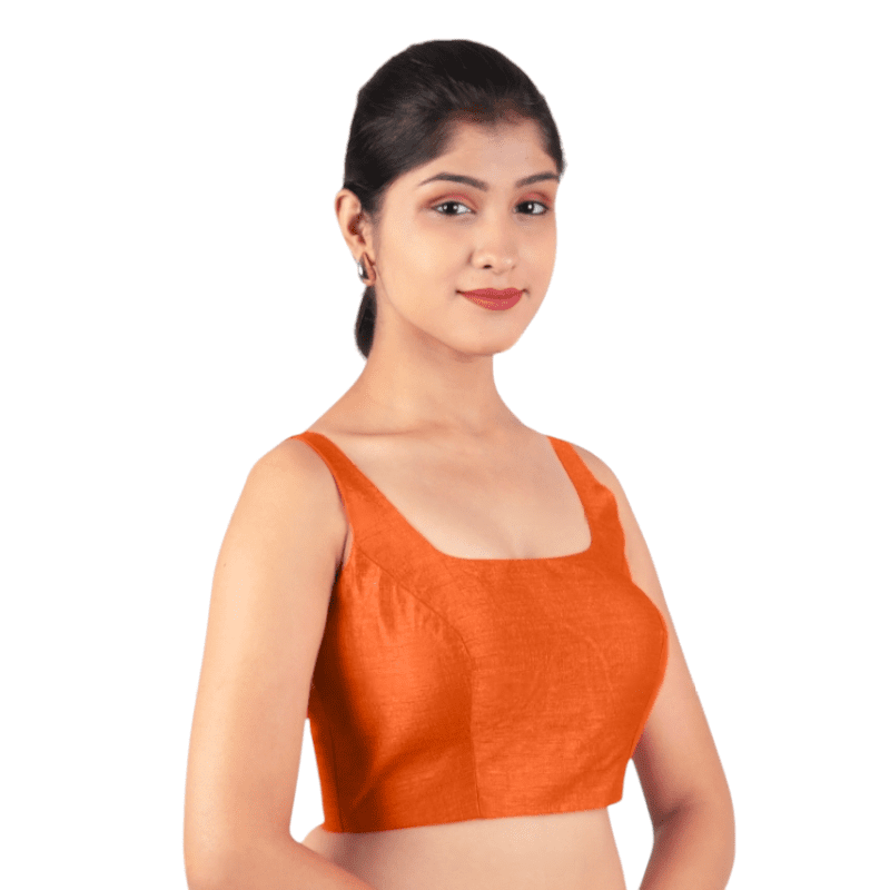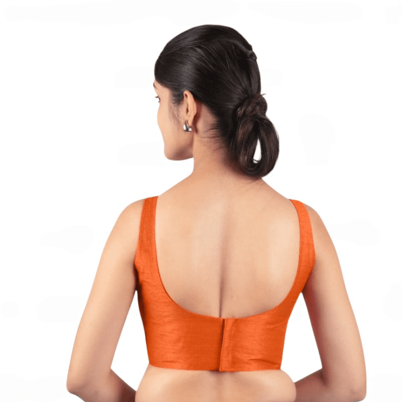 Add a pop of color to your saree collection with the Bangalori Silk Orange Sleeveless Padded Saree Blouse by India Blouse. Made from high-quality silk with cotton lining, this blouse is designed for comfort while maintaining a structured fit. The padded support enhances the shape, while the sleeveless cut brings a modern appeal. Bangalori Silk Orange Sleeveless Padded Saree Blouse featuring a classic U-neckline and a back hook-and-eye closure, it blends traditional elegance with contemporary design. The vibrant orange hue pairs beautifully with contrasting sarees in cream, gold, green, or maroon, making it a versatile piece for weddings, receptions, festive functions, and evening events.