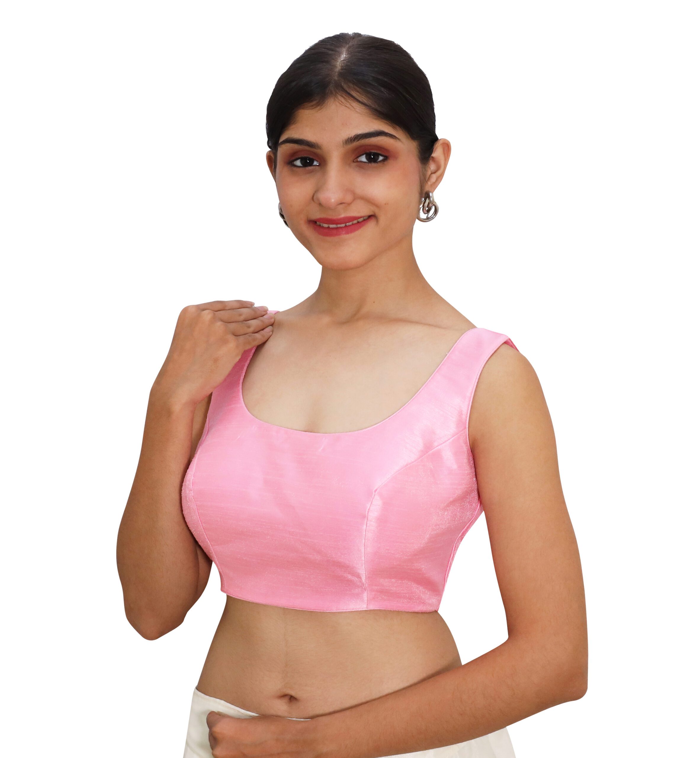 Step into charm and sophistication with the Pink Silk Round Neck Sleeveless Blouse. This Padded Saree Blouse is made by India Blouse. Crafted from premium Bangalori silk, this blouse features a smooth, glossy texture with a modern appeal. The round neckline and sleeveless silhouette make it an effortless style choice, while the padded construction ensures a flattering fit. The back hook-and-eye opening adds convenience and security. Ideal for traditional occasions, festive celebrations, or party looks, this pink silk round neck sleeveless blouse pairs beautifully with contrasting sarees like green, navy, or gold, as well as matching pastel drapes for a graceful finish.