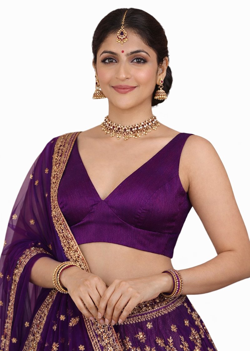Purple Bangalori Silk Sleeveless V-Neck Blouse for Women | Padded Cotton Lining | Designer Saree Blouse