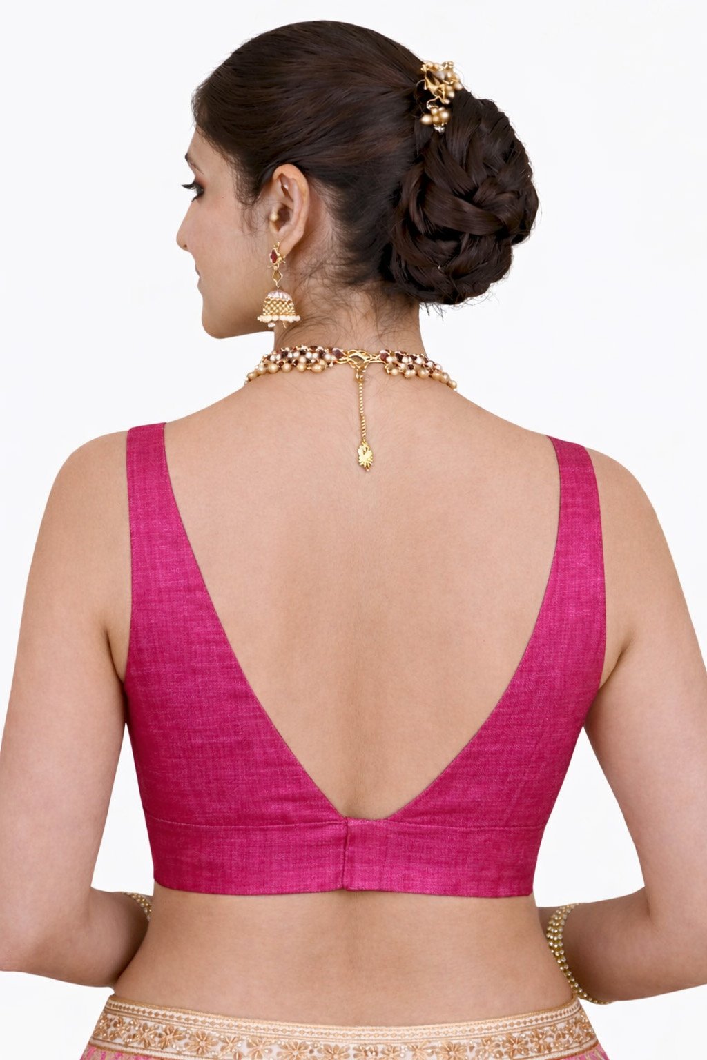 Rani Pink Bangalori Silk Sleeveless V-Neck Blouse for Women | Padded Cotton Lining | Designer Saree Blouse