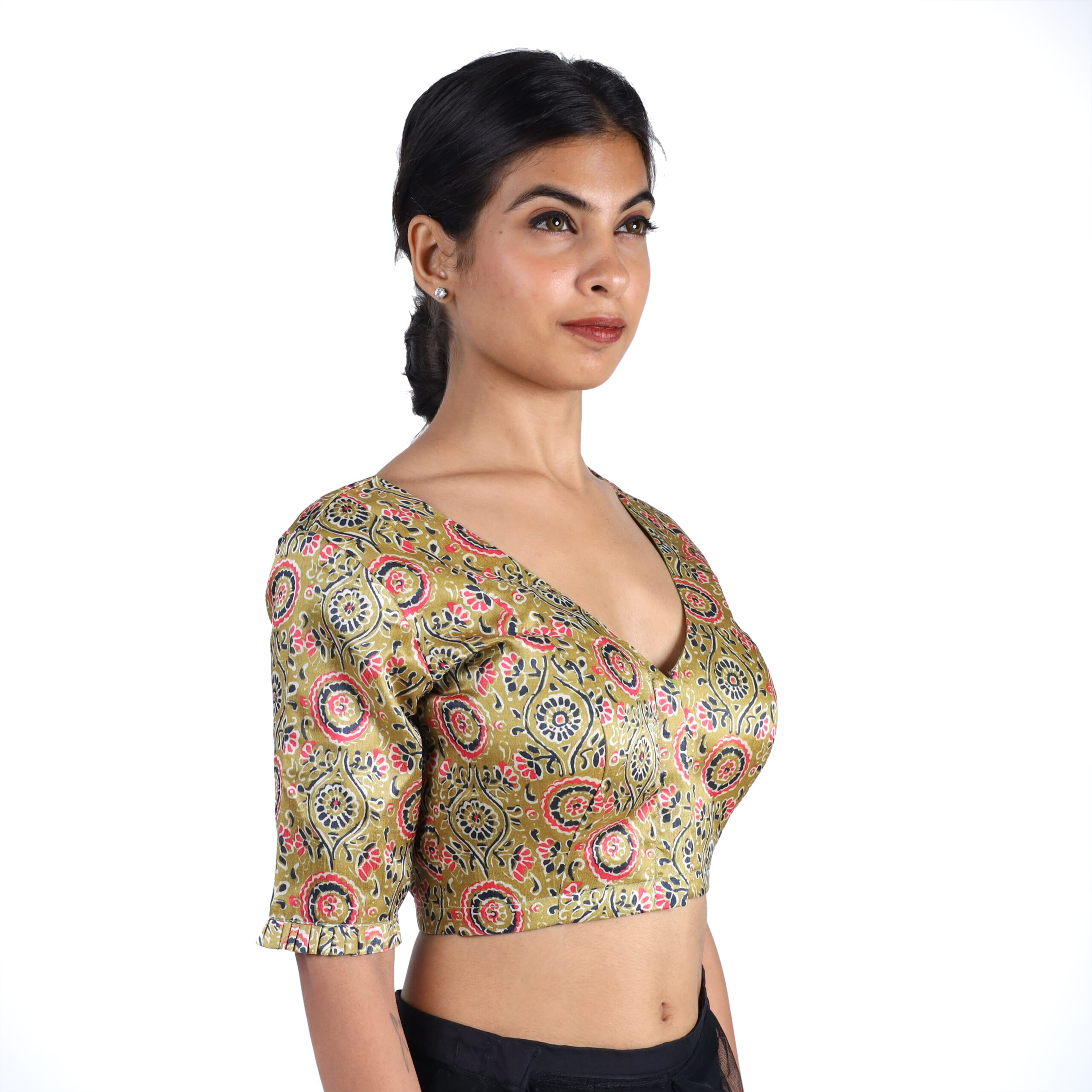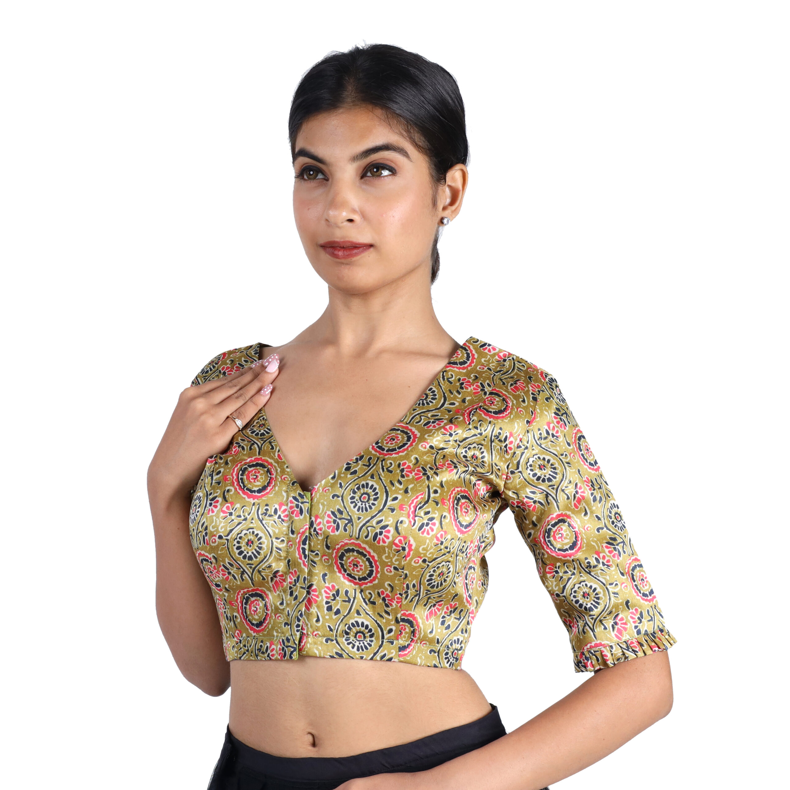 Add a touch of elegance to your ethnic wardrobe with this stunning Silk Olive Green Floral V-Neck Blouse. This Silk Olive Green Floral V-Neck Blouse Crafted from high-quality Art Silk fabric, this blouse features an intricate floral and paisley design in vibrant hues of pink, gold, and navy. The deep V-neckline and elbow-length sleeves add a modern twist to a traditional silhouette, making it perfect for pairing with sarees, lehengas, or skirts for weddings, parties, and festive occasions.