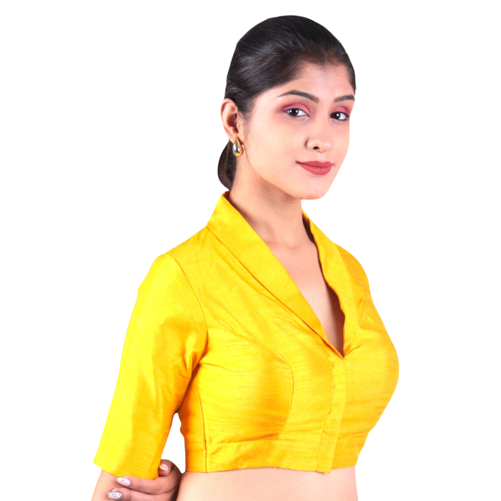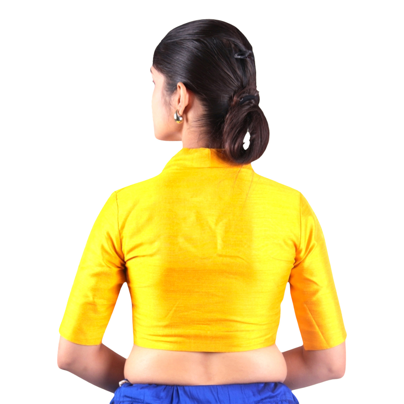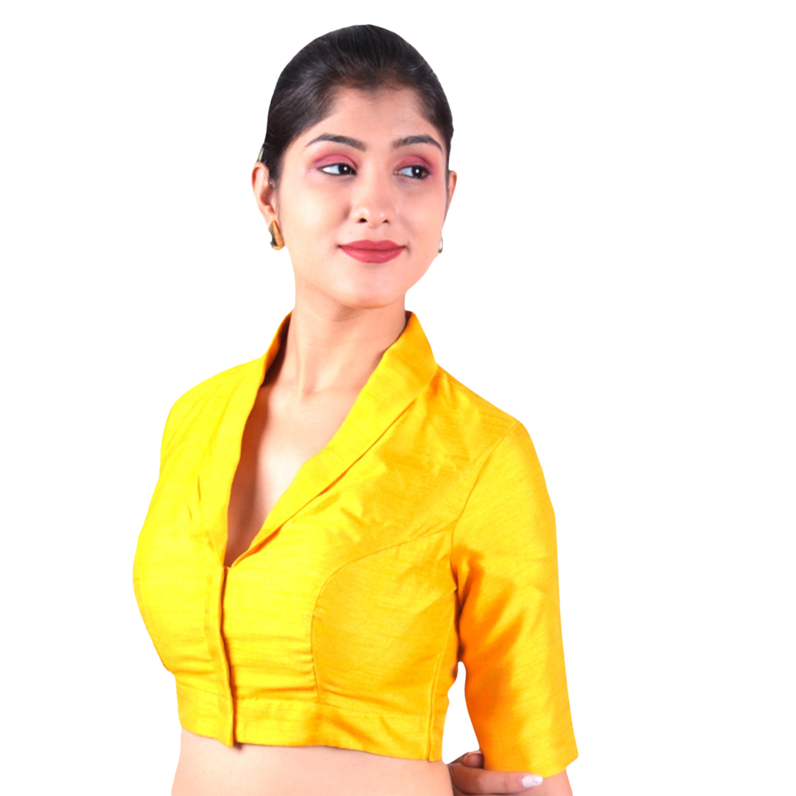 Add a touch of sophistication to your ethnic wear with this mustard collar neck blouse from India Blouse. Crafted from premium Bangalori silk and lined with smooth crepe, this designer blouse for women delivers a luxurious feel along with all-day comfort. The chic collar neck design gives a modern twist to traditional style, while the padded construction ensures a perfect, confident fit without the need for extra innerwear.