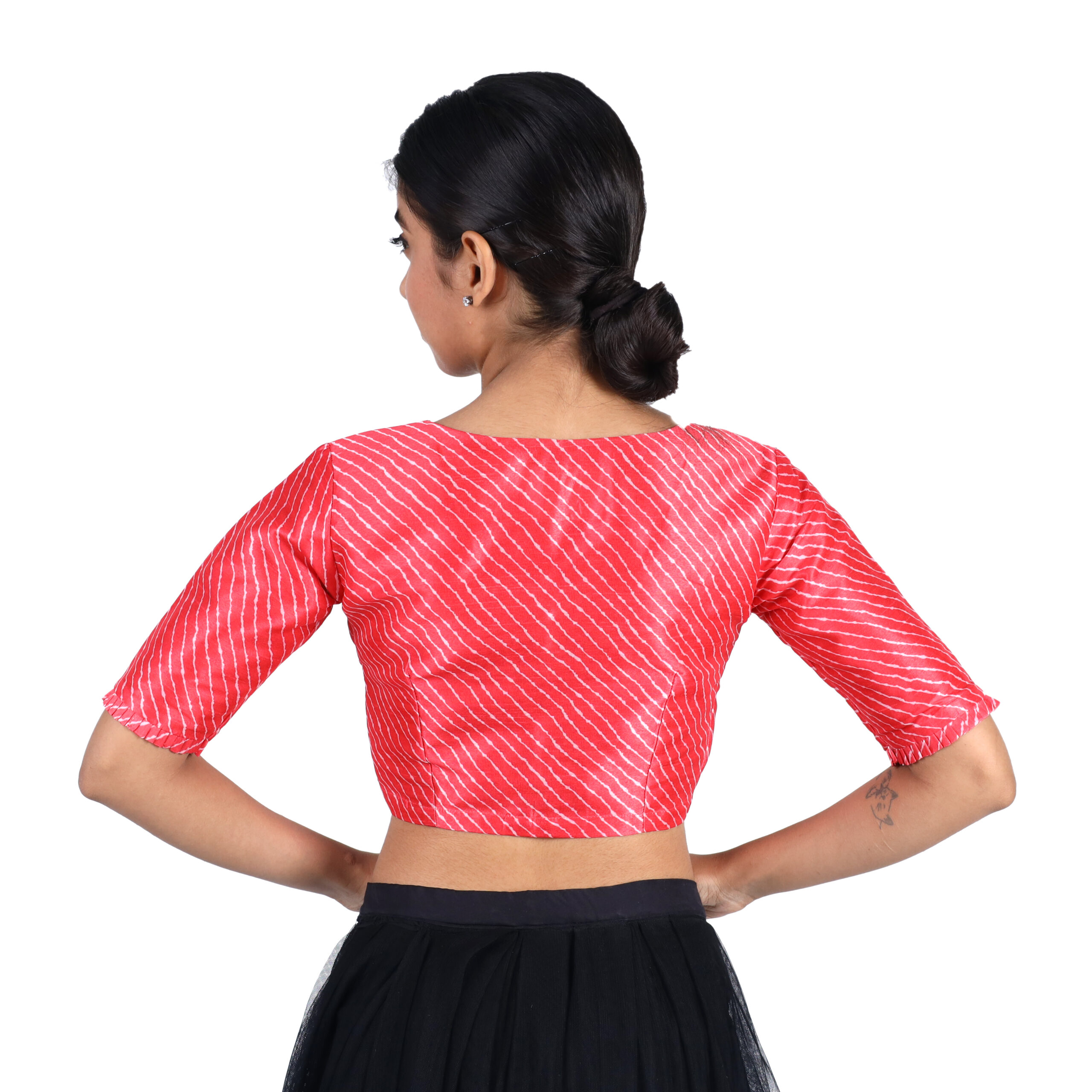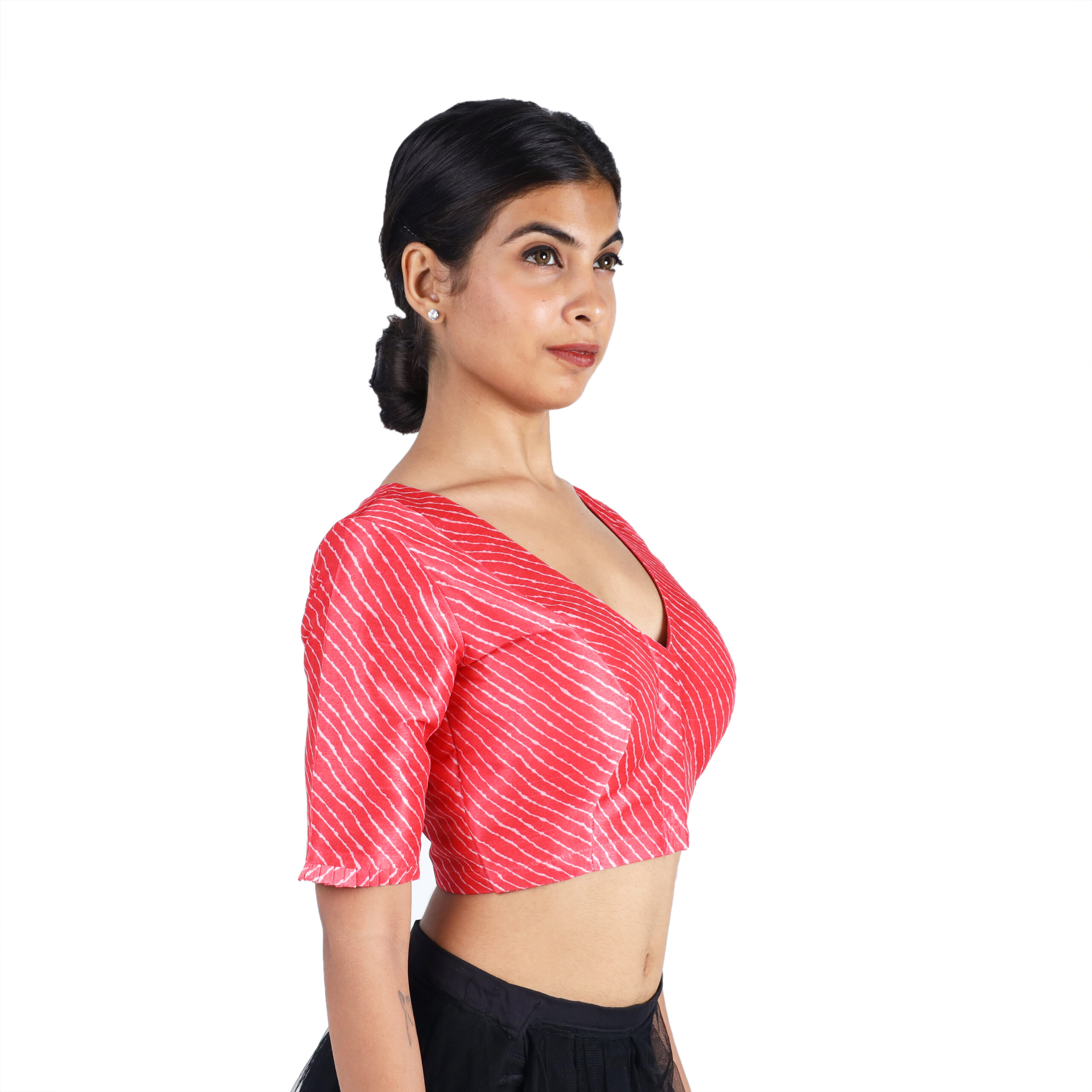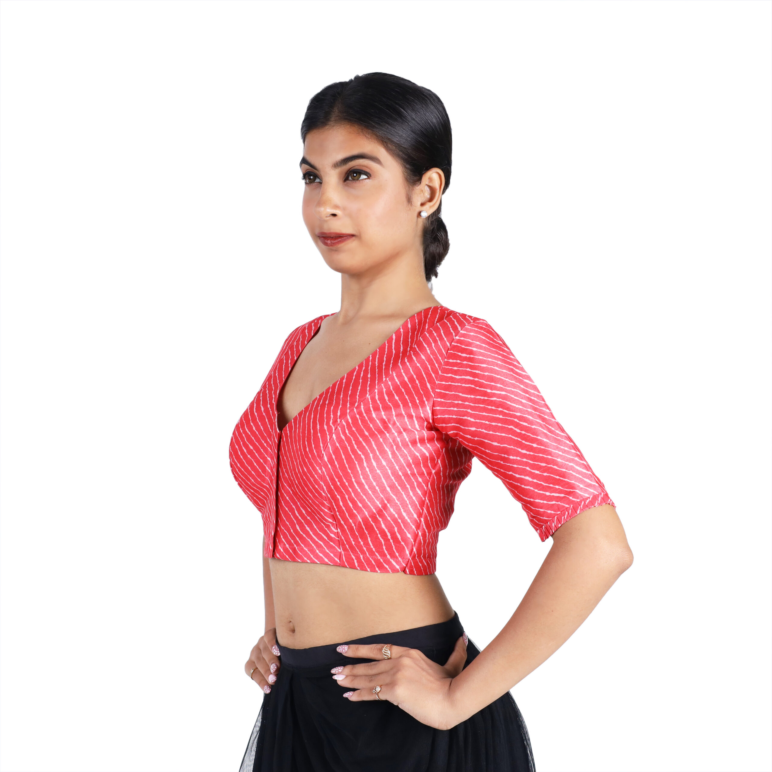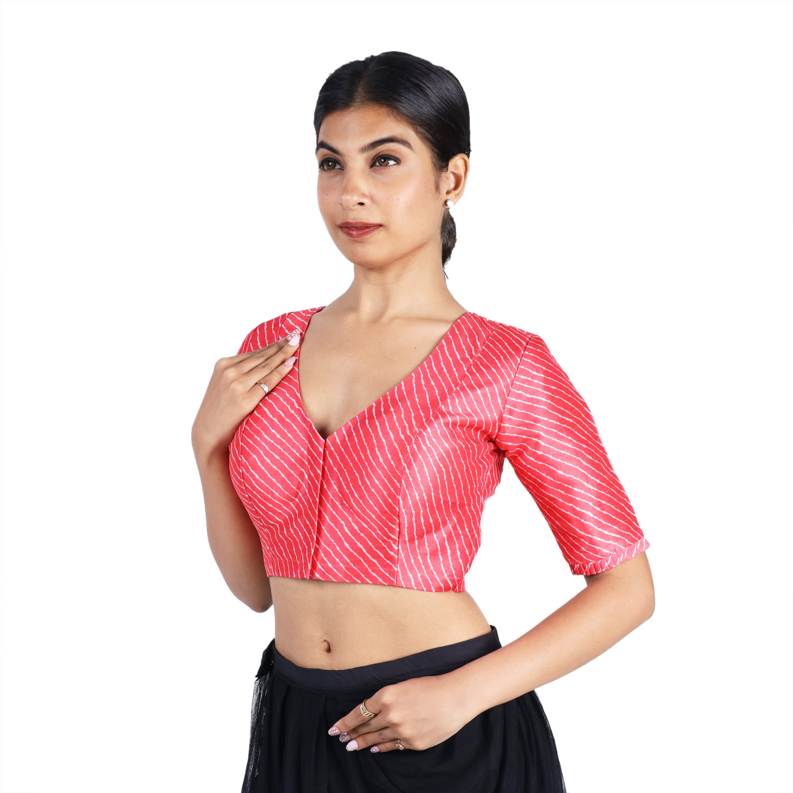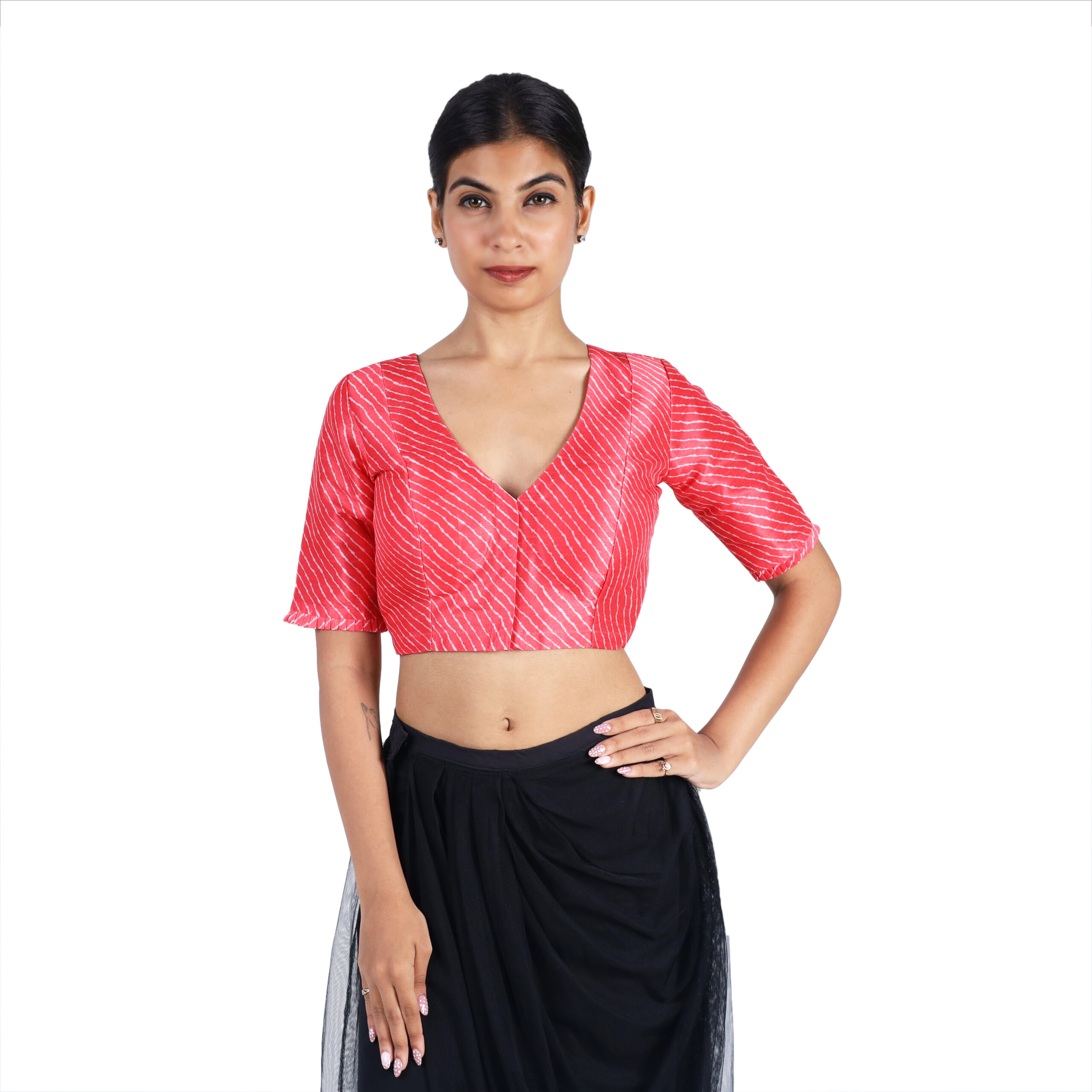 Start from the top of your shoulder (near the neck) and measure straight down to the point where you want the blouse to end. This helps you choose the blouse length that best matches your saree style.